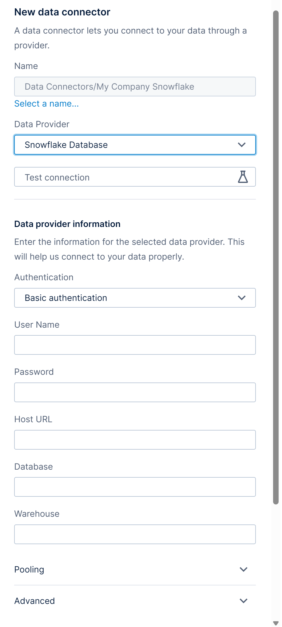 - Hover over the available fields for a tooltip description and expand the Pooling and Advanced sections if additional options are needed.