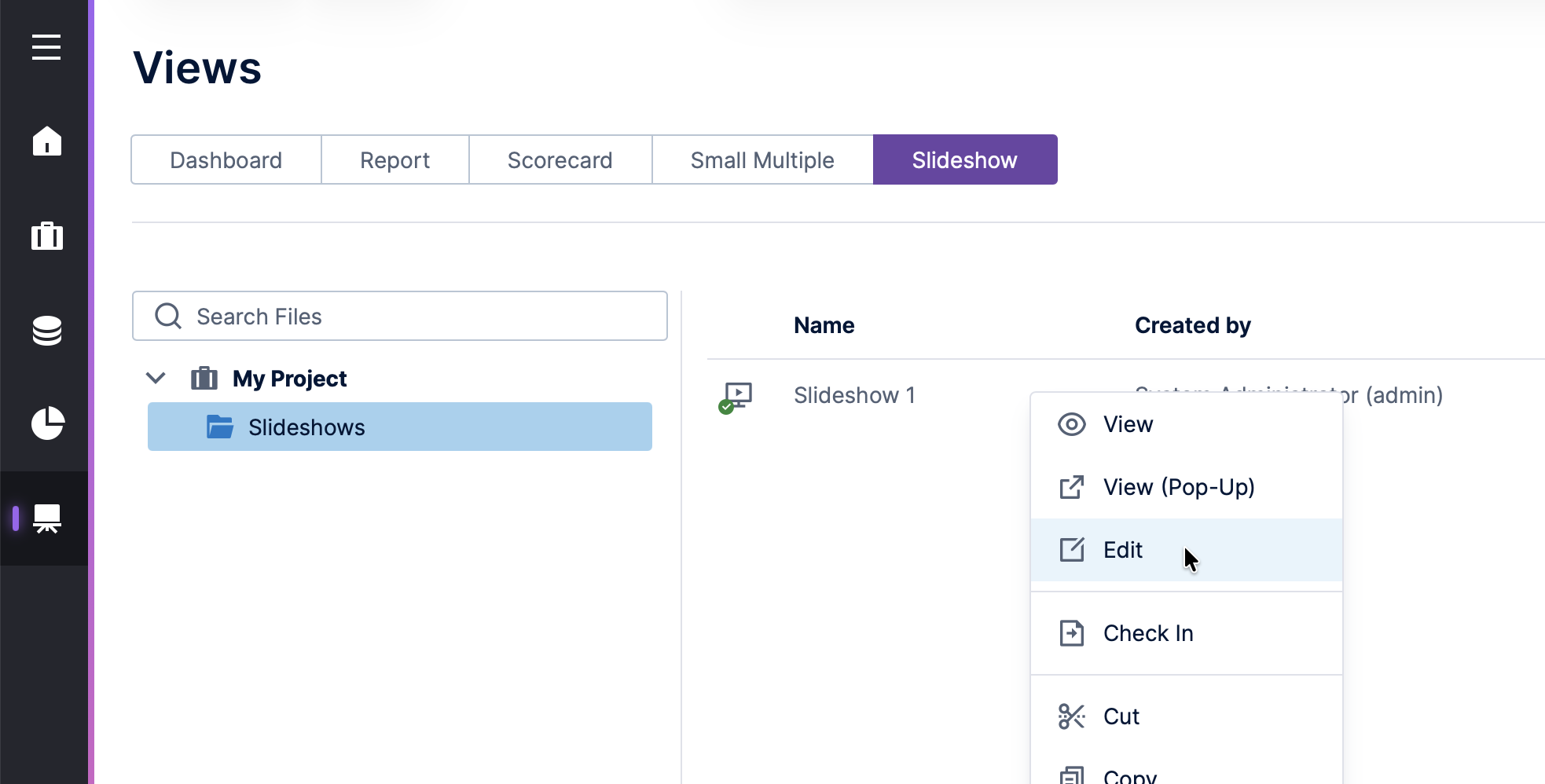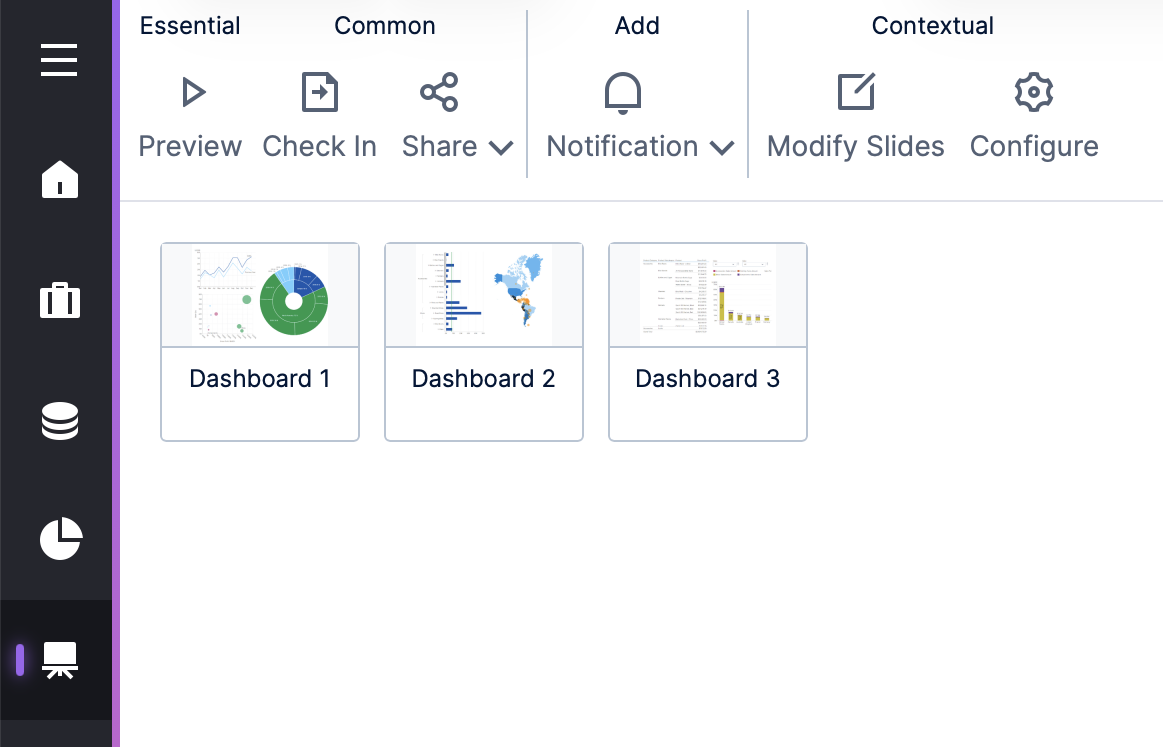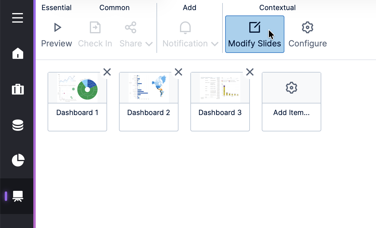 Similar to a PowerPoint presentation, slideshows allow users to display their own selection of dashboards or other views in sequence. You can use them in a presentation, or to rotate through different views for monitoring purposes (e.g., in an office, operation center, or kiosk).