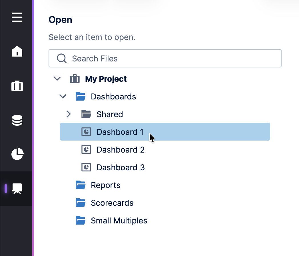 Select a dashboard or other view to be added to the slideshow, then click Open at the bottom of the dialog.