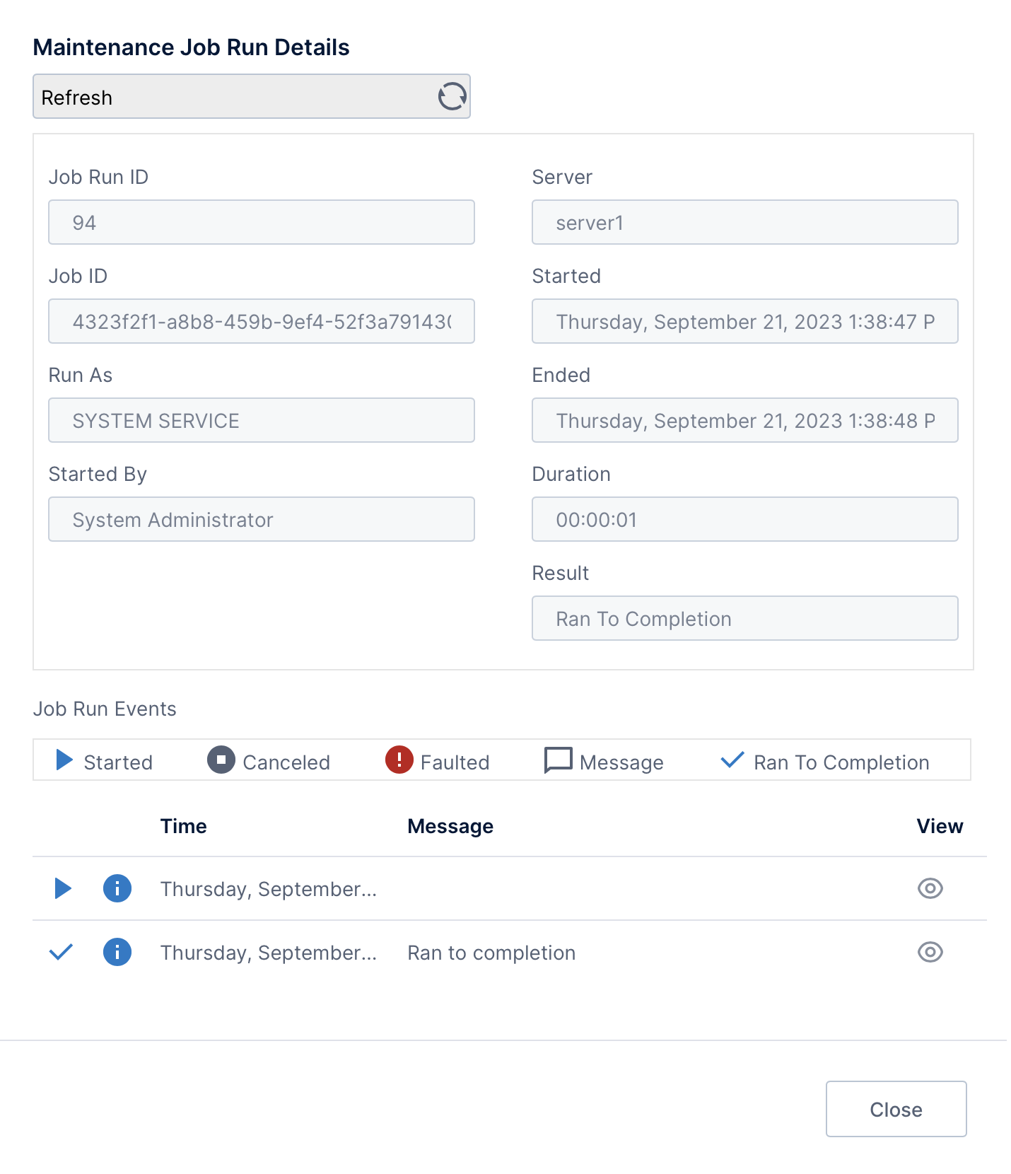 Click the View icon for an event to view the entire message or to copy it. Click the Close button at the bottom of the dialogs to return to the job details.