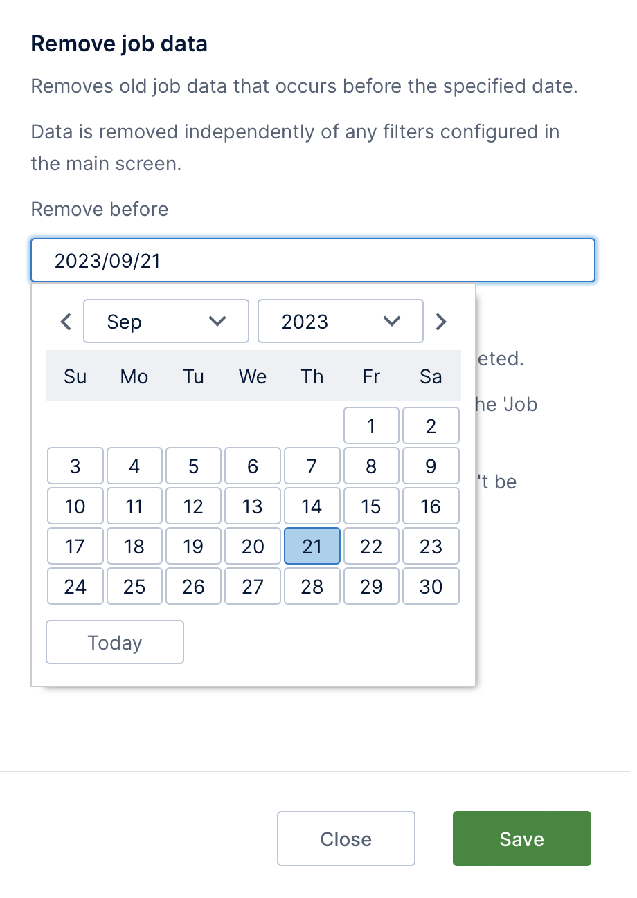 In the Remove Job Data dialog, click the box under Remove before, and then use the calendar to select a date. All job data older than this date will be cleared. Click Submit to clear the data.