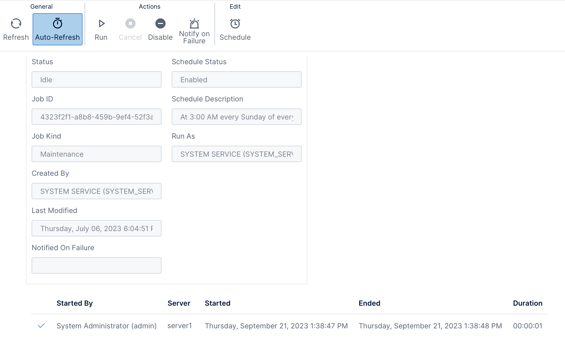 - Rebuild indexes – Rebuilds the indexes in the application and warehouse databases to avoid index fragmentation. Schedule or disable/enable the job from the toolbar when viewing the job details.