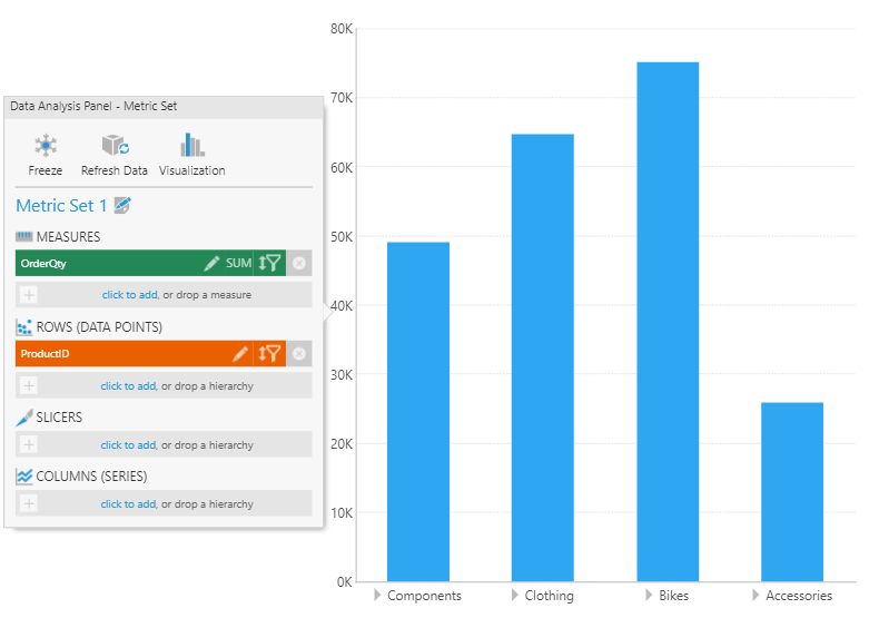 From the toolbar, re-visualize the metric set as a bar chart and observe that the bars are sorted according to Product Category names in ascending or alphabetical order. This is the default sorting behavior for the Product hierarchy and its levels.