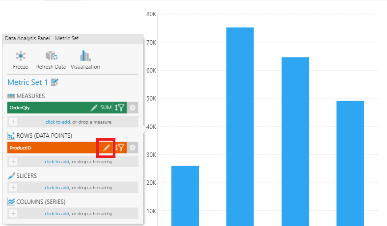 In the data analysis panel, click the Edit icon for the Product hierarchy.