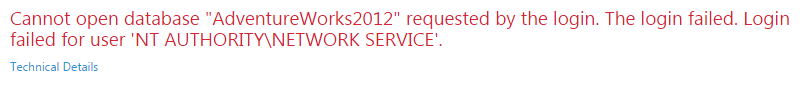 - When you try to create a new data connector using Specified Windows credentials, you receive an error similar to: Cannot open database 'AdventureWorks2012' requested by the login. The login failed. Login failed for user 'NT AUHTORITY\NETWORK SERVICE'.