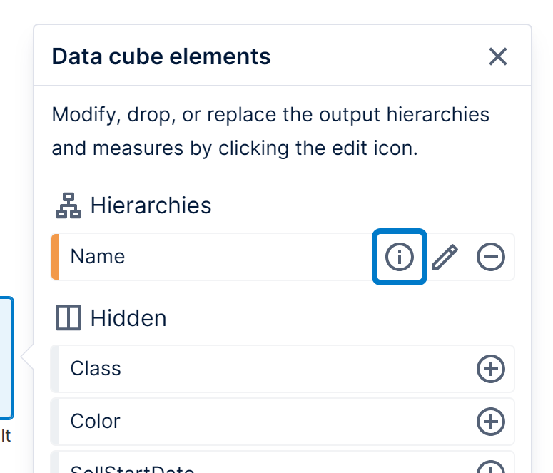 A hidden measure or hierarchy is hidden from the data cube output but will still be available for subsequent linking in hierarchy keys (e.g., if you need to use the data cube later to define a hierarchy).