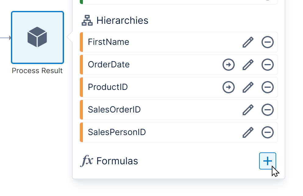 In version 25.2 and higher, you can click the plus button next to Formulas in the Data Cube Elements panel to add a formula expression to the data cube's output, which can then be used and reused in metric sets.