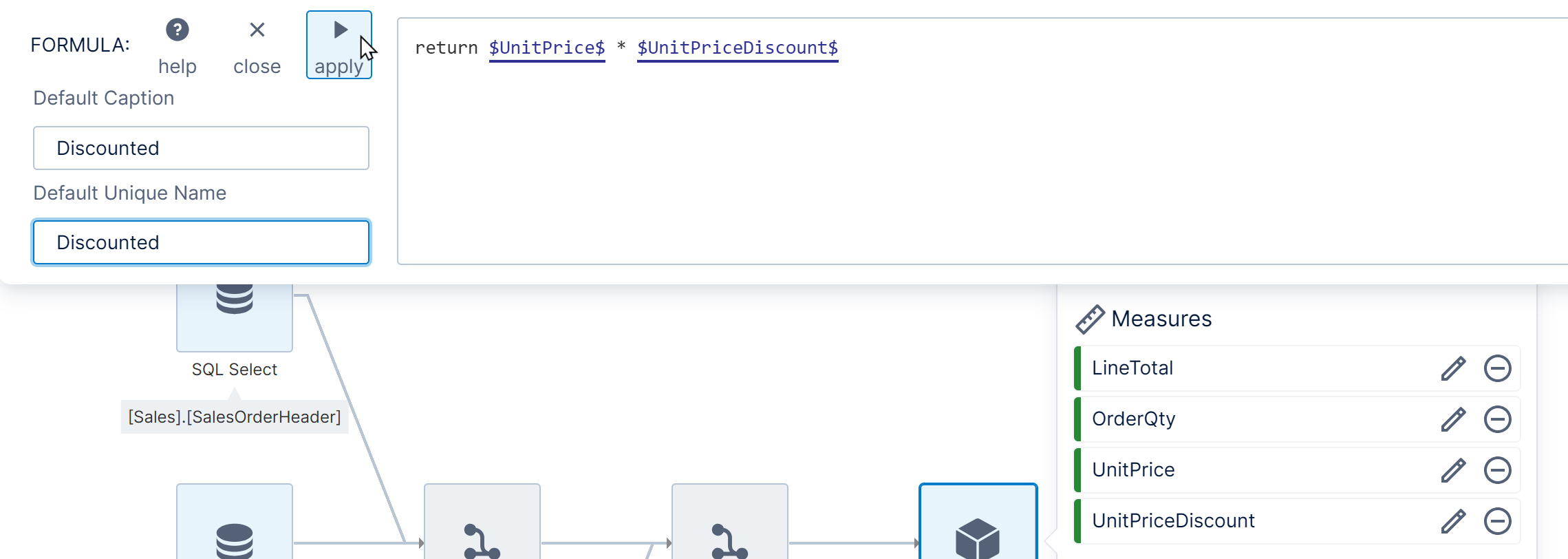 Also enter a Default Caption and Default Unique Name on the left, and then click apply to save your formula. It will now be listed as one of the data cube elements.