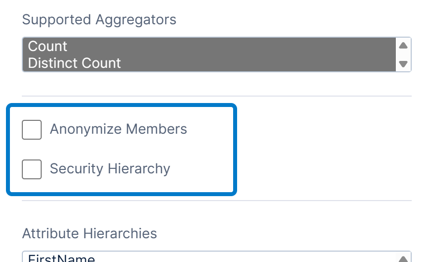 The Anonymize Members option is available for implicit hierarchies (except for DateTime columns), and when enabled will generate a new value to replace each unique original value in the column so that it does not directly identify the original. The generated values may change over time.