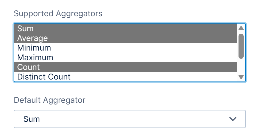 Both numeric data and non-numeric data elements have a Supported Aggregators setting, which determines which aggregators are available when this data is added under Measures in a metric set. To select multiple, hold the Ctrl, ⌘, or Shift keys or drag while selecting.