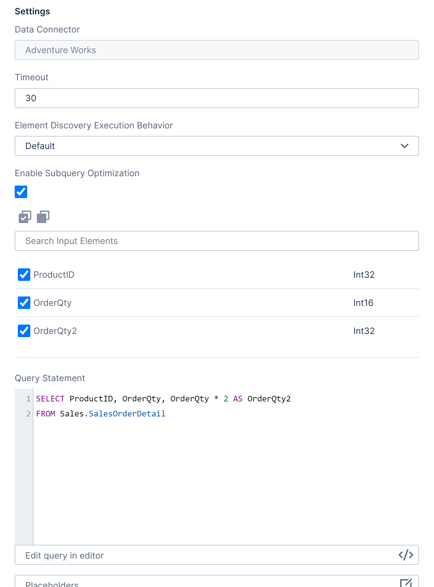 You can edit the Query Statement directly from the configuration dialog, or click Edit query in editor to reopen the same Script Editor window shown above that opened when first adding the Manual Select.