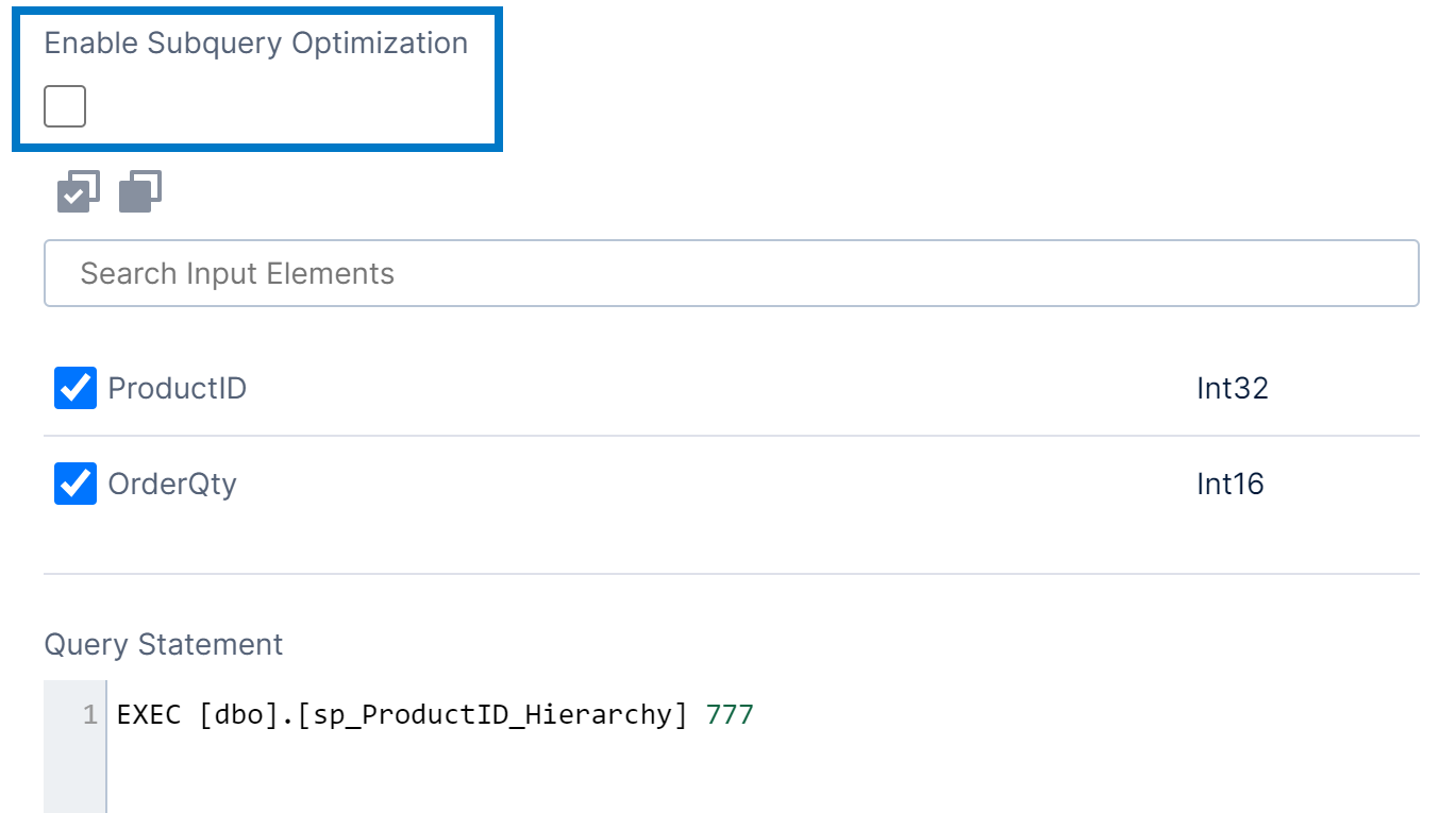 Uncheck the Enable Subquery Optimization option if your query cannot be enclosed in a SELECT statement, including statements executing a stored procedure or using advanced or database-specific SQL features such as creating temporary tables. You may also need to uncheck this option if your data connector uses an ODBC driver that incorrectly reports its capabilities.