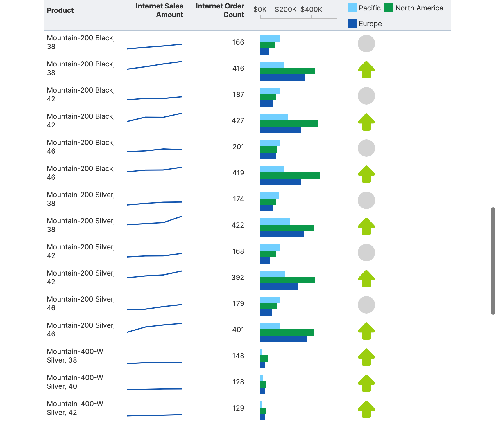 This walkthrough shows you how to use scorecards to create a customized table with complete control over layout and support for any visualization in its rows. This example displays a row for each product with a different visualization used for each measure.