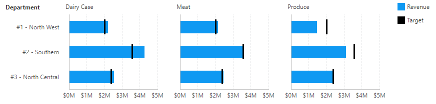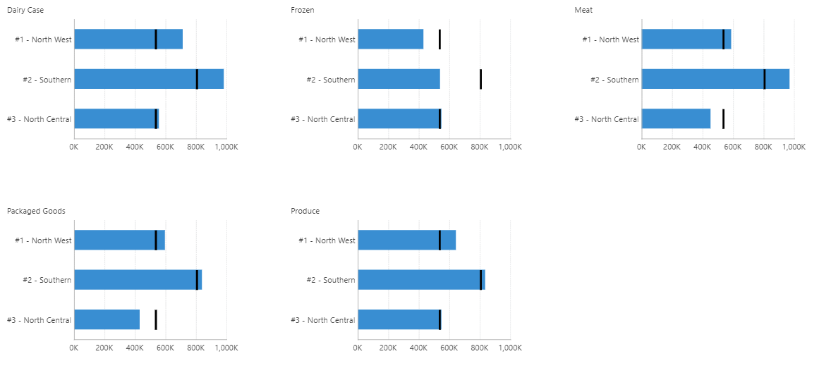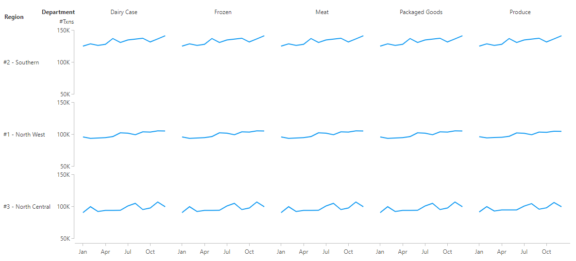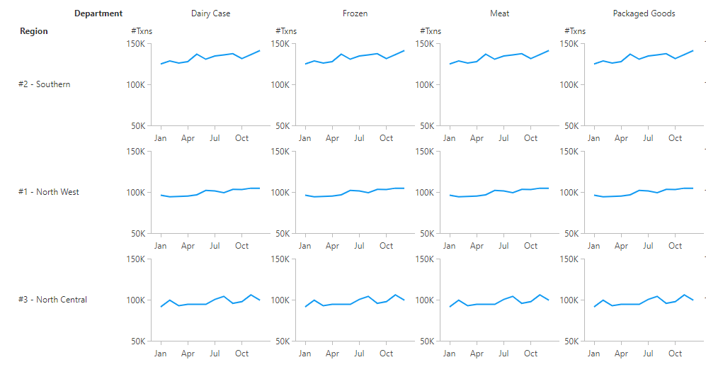 Charts are a common visualization to use in small multiples, and they support reproducing the same range of values along each chart axis to ensure meaningful comparisons between each chart in the series.