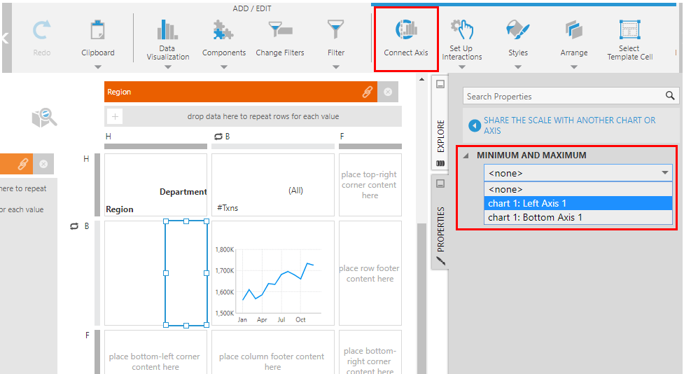 In the toolbar, click Connect Axis. In the Properties window that opens to the shared scale properties, choose the axis or scale from the dropdown that should be replaced by this axis in the header.