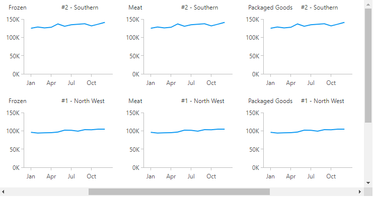 When grouping the small multiples into both rows and columns, the rows and columns will not wrap and will instead extend to fit however many values are currently selected from your data. One or both scrollbars may appear if all of the columns or rows do not fit.