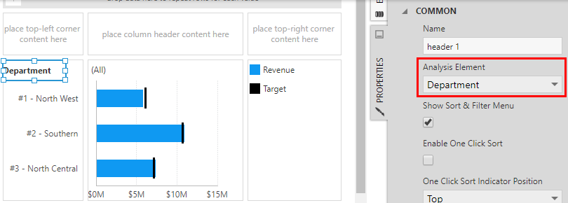 Each 'corner' area is displayed only once, above or below the row headers and before or after the column headers. These areas make the most sense, for example, to add a Header for each series grouping hierarchy when displaying a crosstab.