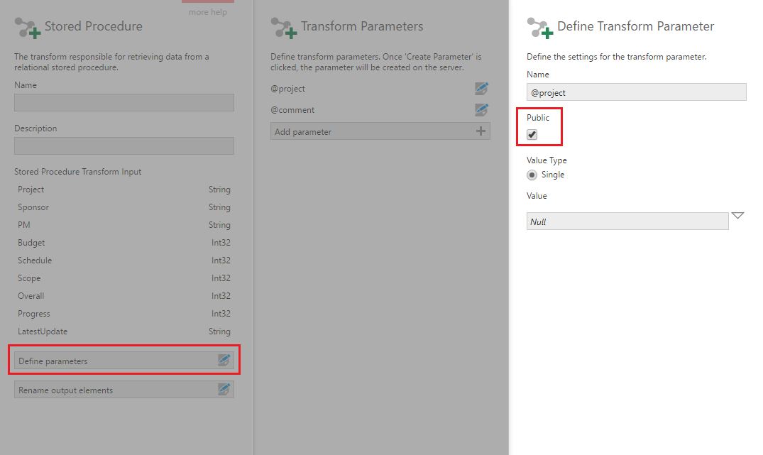 Select the @project parameter defined in the stored procedure to pass a value to it.