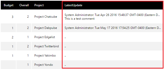 Create a stored procedure that receives two parameters: the comment column (LatestUpdate) and a unique ID such as the Project name in the sample data, which identifies one specific row to be updated in the database.