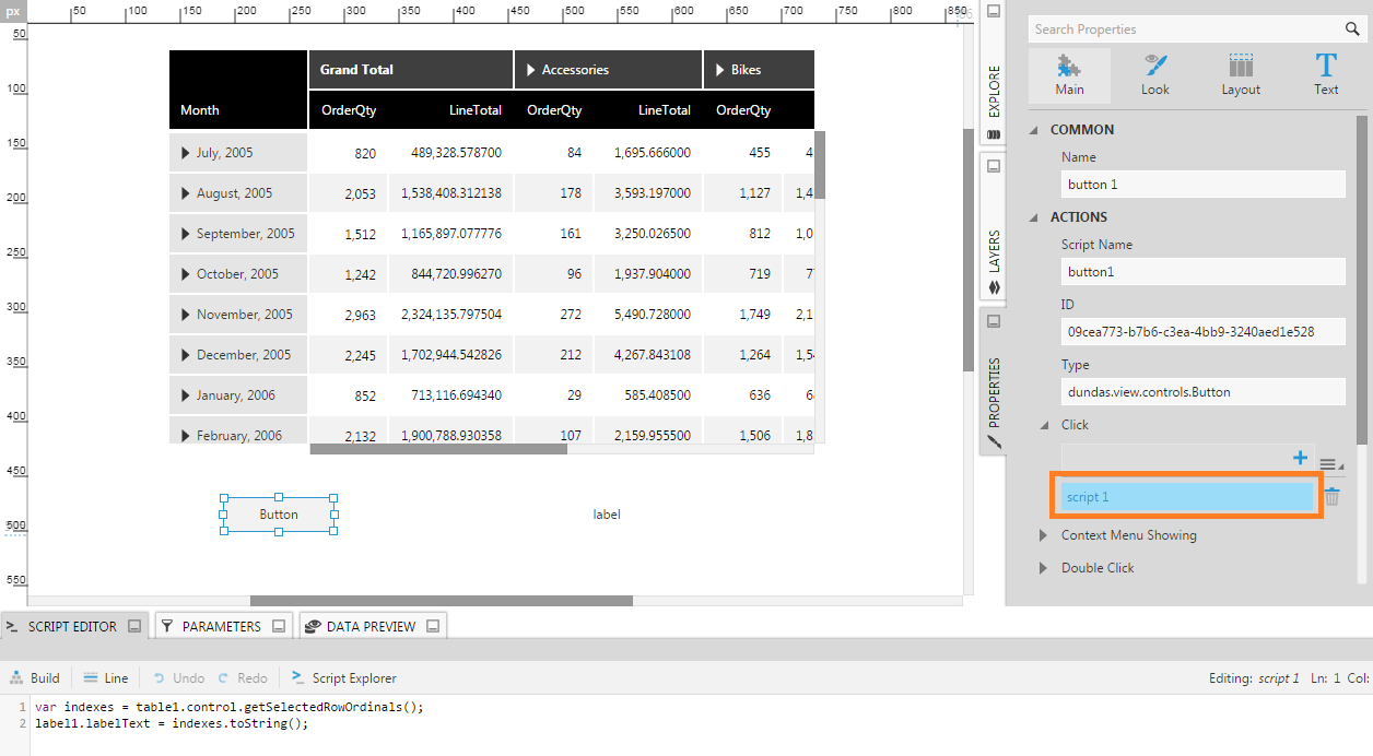 Switch to View mode and select one or more rows in the table. Click the button to see the selected row indexes/ordinals appear in the label.
