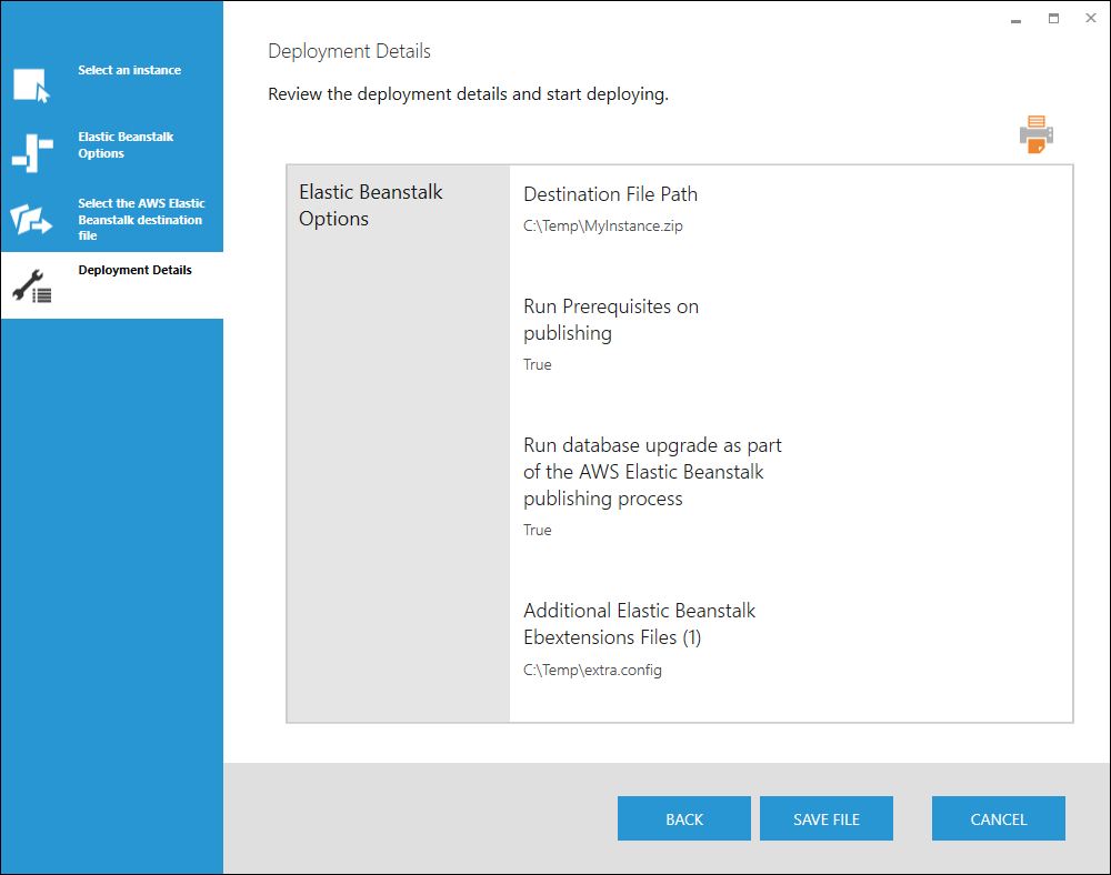 Review the deployment details and click Save File to begin creating the AWS Elastic Beanstalk source bundle .zip file in the specified location.