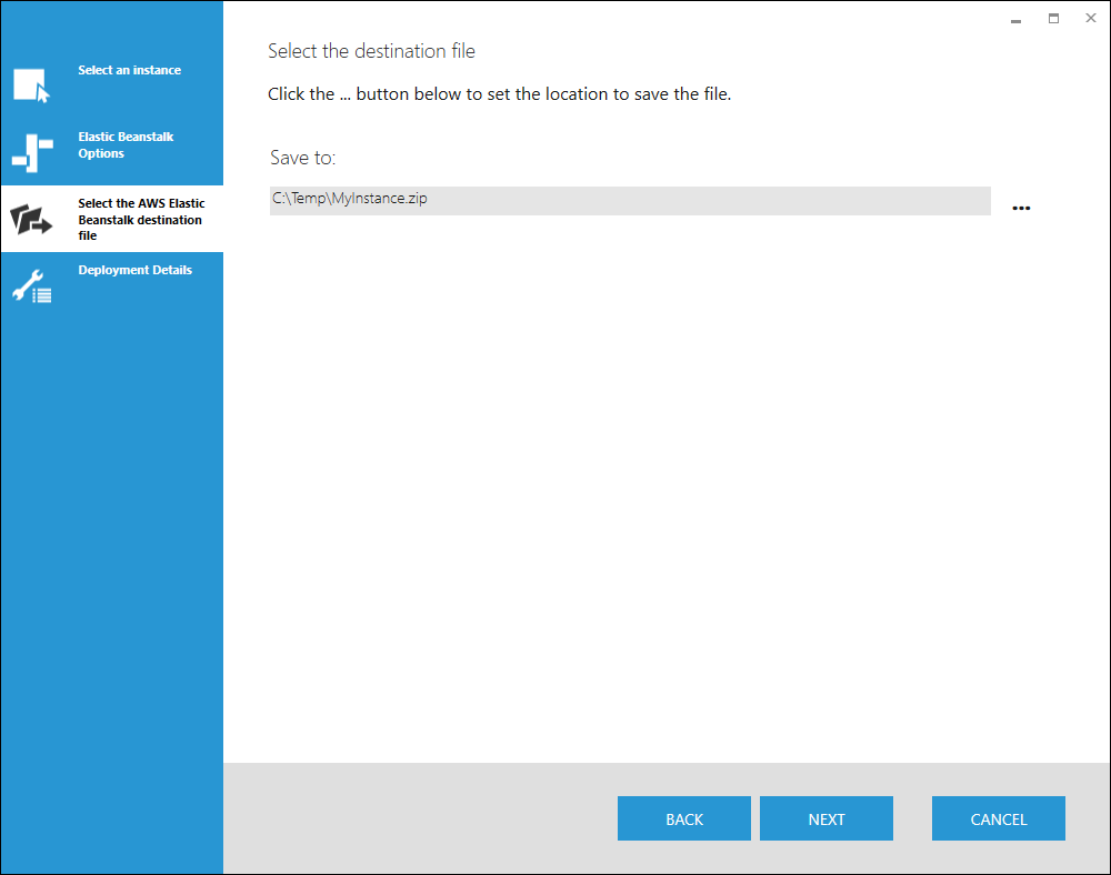 Select a location and provide a file name for the AWS Elastic Beanstalk source bundle. Click Next.