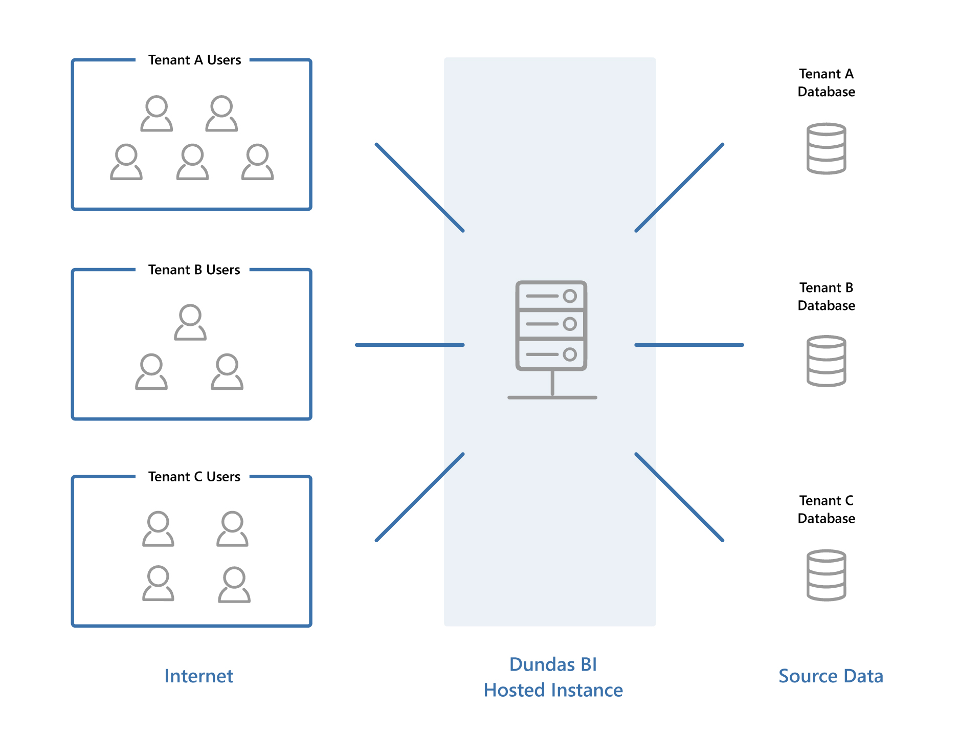 Your customers shouldn’t know about or have access to data from other users using your application. Leverage Dundas BI’s support for multitenant deployment scenarios to effortlessly and securely create and manage tenants, each one completely separate from one another, and present them with a rich suite of reporting options that are custom-built to their specific needs, using their specific data.