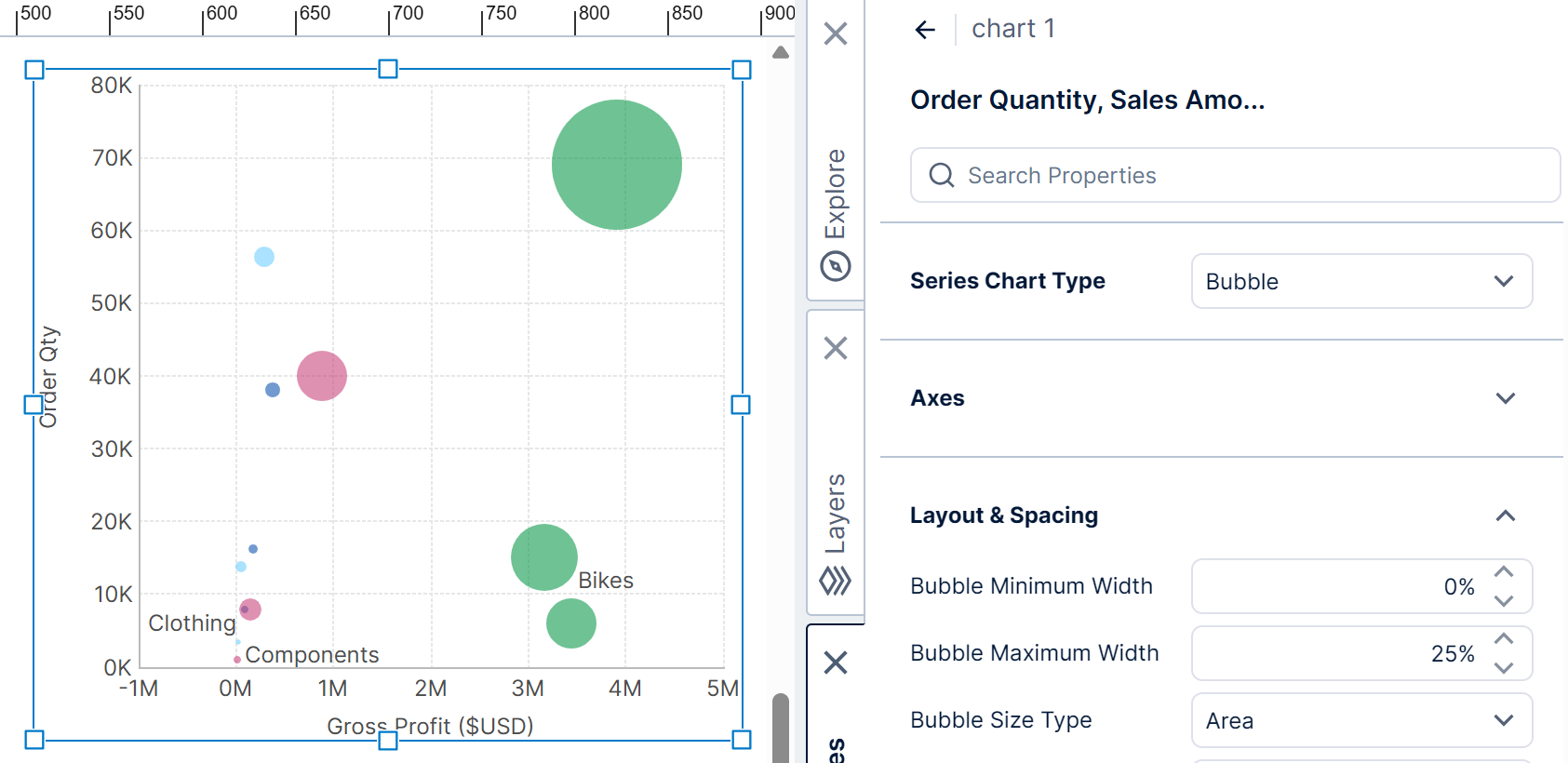For example, bar sizes, overlapping, and gaps can be found in the layout section for a series of bars. For bubbles you will find settings determining bubble sizes.