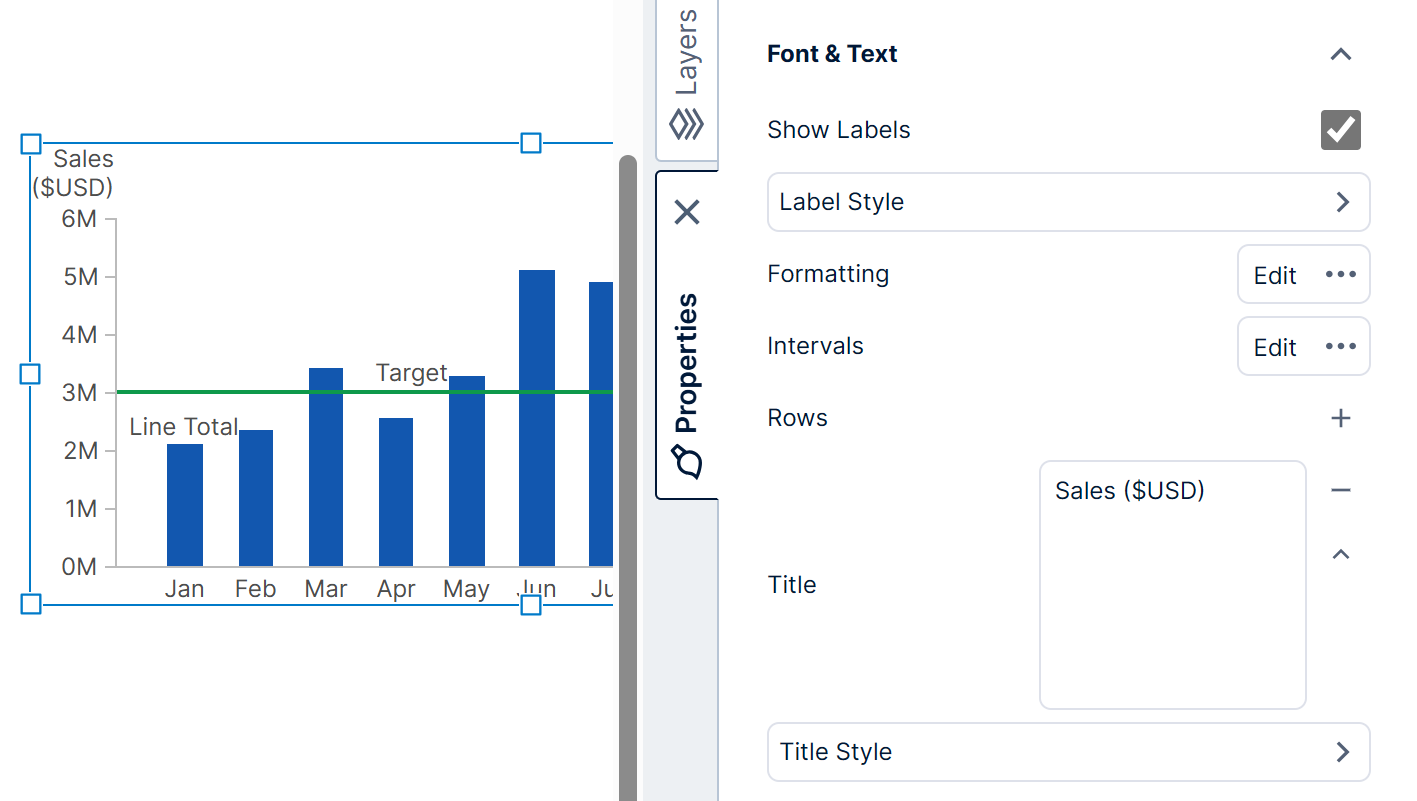 Chart properties also allow you to further customize the text, or to set up multiple labels: for example, one label on top of each bar to display its value, and another inside each bar displaying its percentage from a formula.