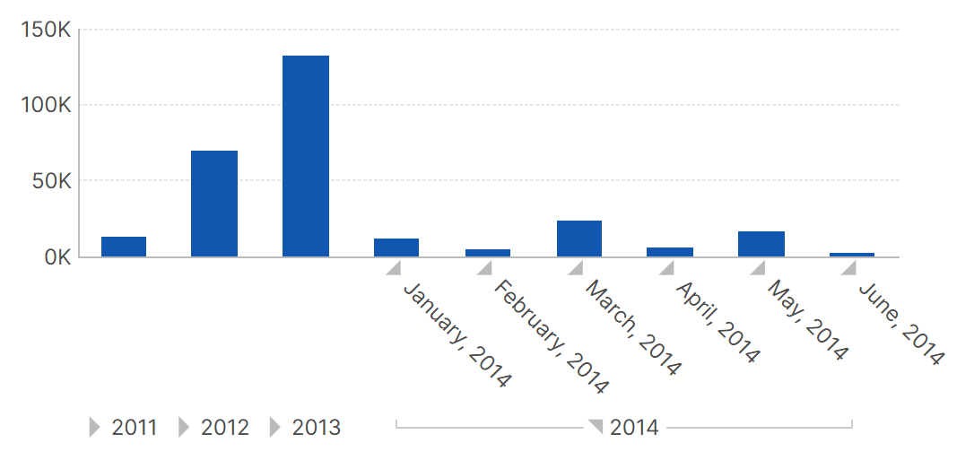Charts typically fit all of their data points into the set size of the chart, but you can also zoom in to view the data in more detail or to restrict the number of data points displayed at a time.