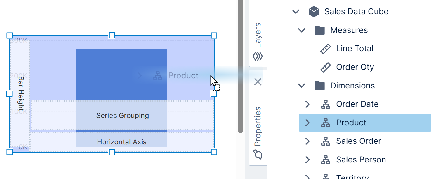 Next, drag data from a data connector or data cube in the Explore window onto the empty chart. When dragging more data you can drop it on the plain blue highlighted chart area if you don't want any specific labeled area.