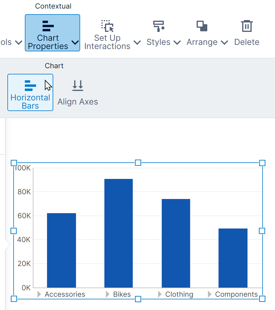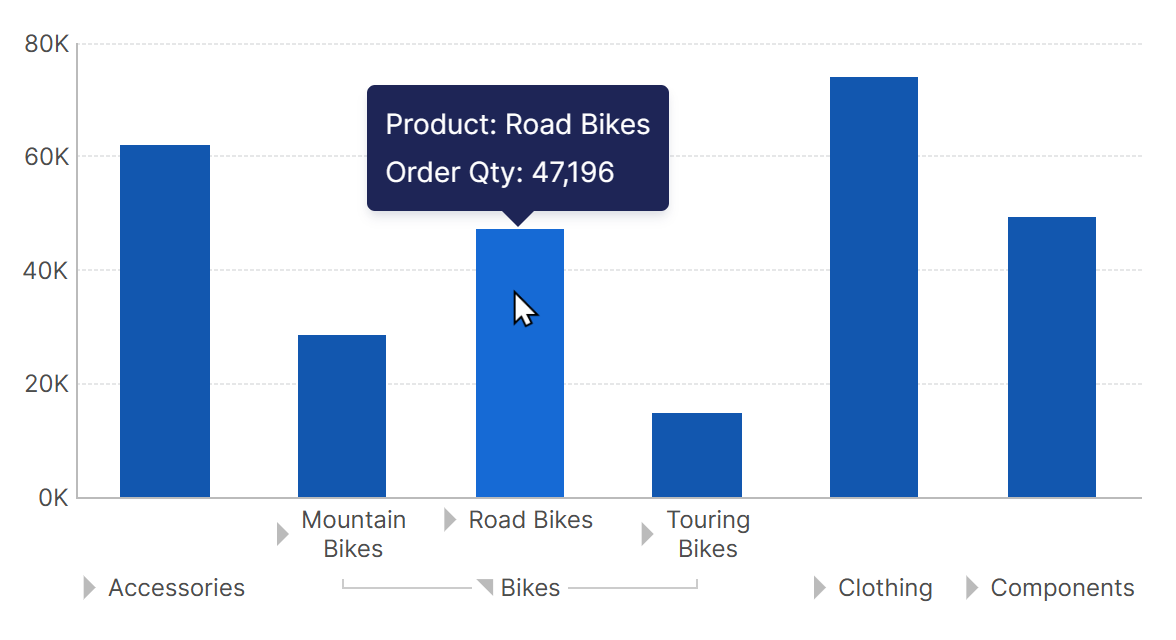 To interact with the chart, switch to View mode. If a multi-level hierarchy such as Product was added, you can click on a triangle along the bottom axis to expand one of the hierarchy values (e.g., Bikes). Hover over one of the expanded bars to see a tooltip showing the corresponding data values.