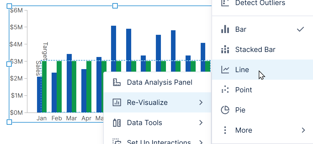 If you have multiple series of data points (e.g., for two measures), you can re-visualize each series independently. For example, right-click on a series of bars (you'll see a selection rectangle around them), choose Re-Visualize from the menu, and then next to the currently selected chart type (e.g., Bar) find and select a different one such as Line.