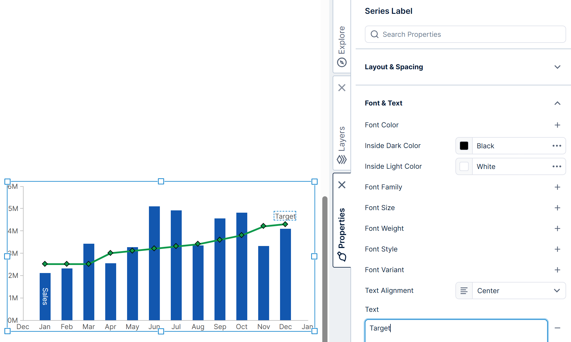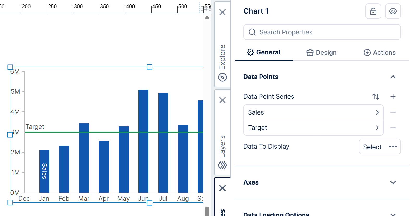 Charts are automatically configured with data point series as you drag and drop data onto the chart from the Explore window.