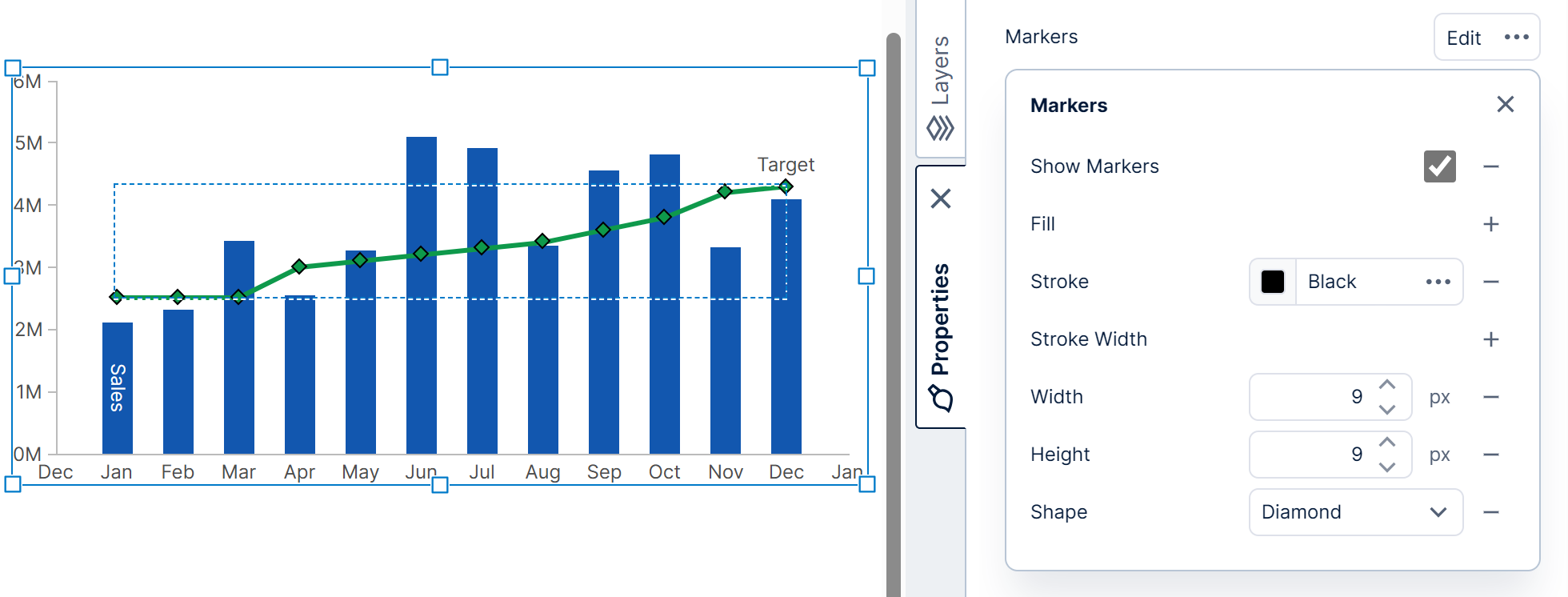 To display and customize markers, edit the properties for a series, open Lines & Fills (Look tab in earlier versions), and then open Markers: