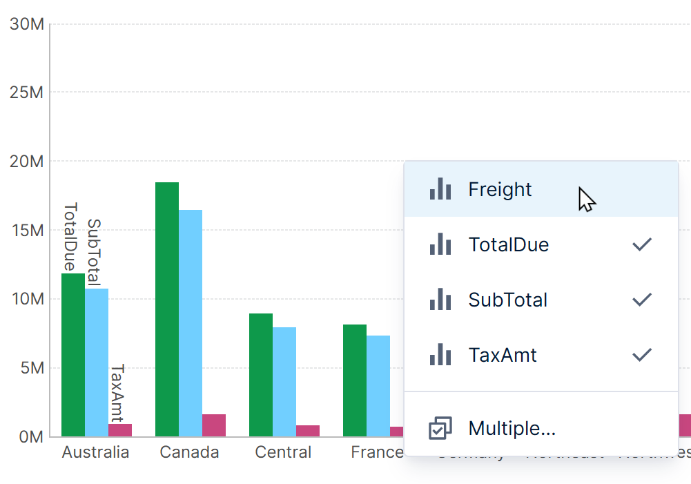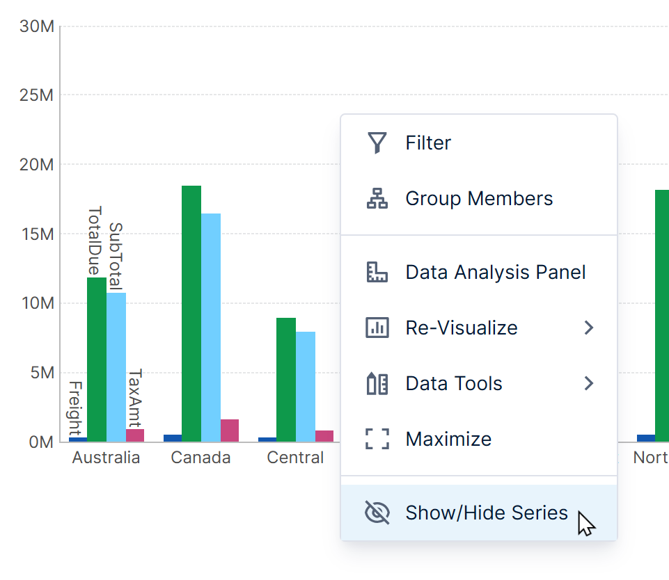 Any user viewing a chart with multiple series can also show or hide them using the context menu: right-click (or long-tap) the chart and select Show/Hide Series. (Switch to view mode first if you are currently editing a dashboard or other view.)