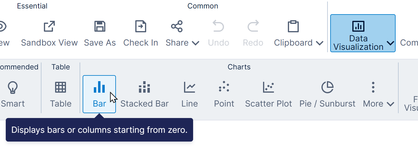 To add a chart when editing a dashboard, report, or other view, click Data Visualization in the toolbar and then select the type of chart you want to start with.