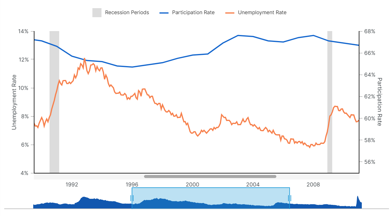 In the figure below, the light blue area in the bottom chart can be moved and resized to zoom and pan around data in the top chart: