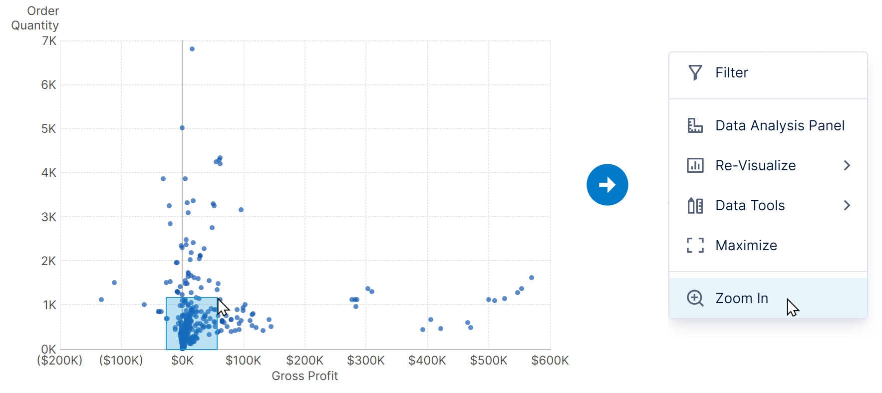 Another example is to change the Select Action to Zoom In instead of the default Select Data Points, which will automatically zoom the chart to the selection box.