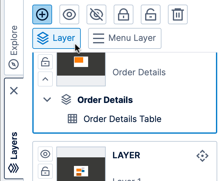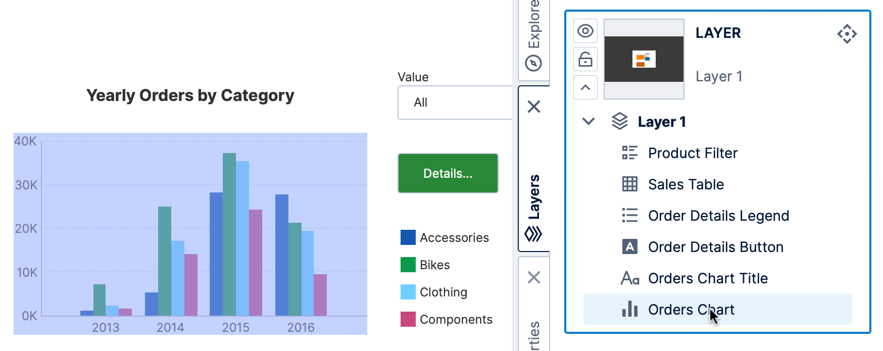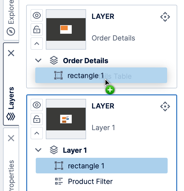 Whenever you add an element to the canvas, the element is assigned into the current layer. There is always at least one layer in every dashboard, report, or other view, and you can also add new layers and insert elements into them as you like.